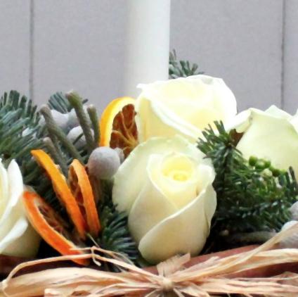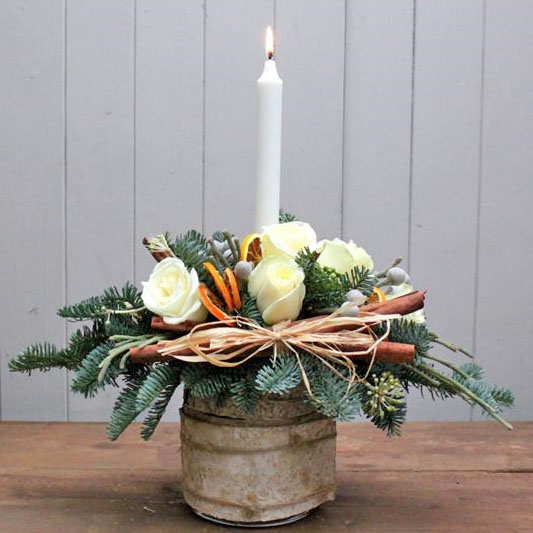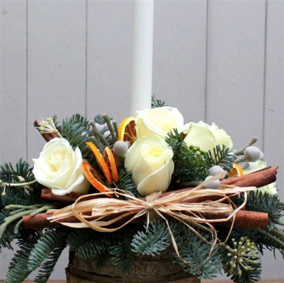 Scented spruce, cinnamon, white roses and brunia combine to make this beautiful Christmas table centre. Arranged in a vase to compliment the design.